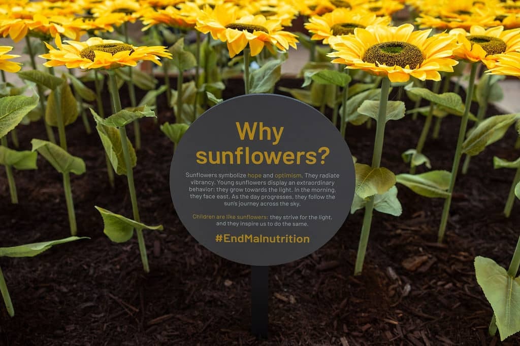 Sunflowers are a symbol of hope and resilience. Each sunflower in the rotunda represented 100,000 children who received life-saving care as a result of the 2022 funding, which included a historic investment in Ready-to-Use Therapeutic Food (RUTF). As a result of this increased funding, UNICEF reported its largest malnutrition response on record, reaching 7.3 million severely wasted children with RUTF – 35% more than the year prior. And this is why the installation was called “A Hope Garden.” Because child death from malnutrition is a problem we can solve. Children strive for the light, just as sunflowers do – and children inspire us to strive for the light, too.