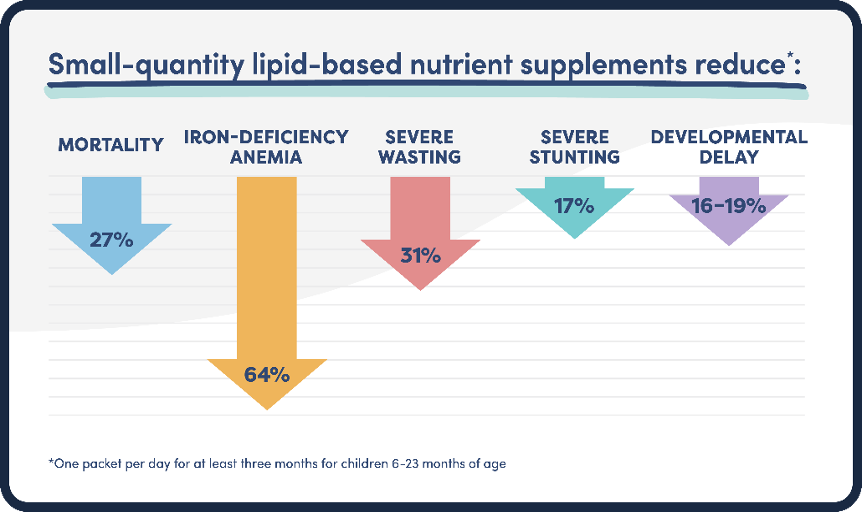 SQ-LNS are food-based supplements designed for the prevention of malnutrition in children 6-24 months of age. SQ-LNS for infants and young children contain the daily recommended intake of necessary micronutrients and can be mixed with foods prepared in the home or consumed as is, allowing for flexibility in feeding practices. A recent analysis confirmed that feeding a child four teaspoons of SQ-LNS for at least 6 months can reduce their risk of mortality by 27%. In addition, these supplements are shown to decrease anemia, as well as cases of severe wasting and severe stunting. They’ve also proven to reduce developmental delays.